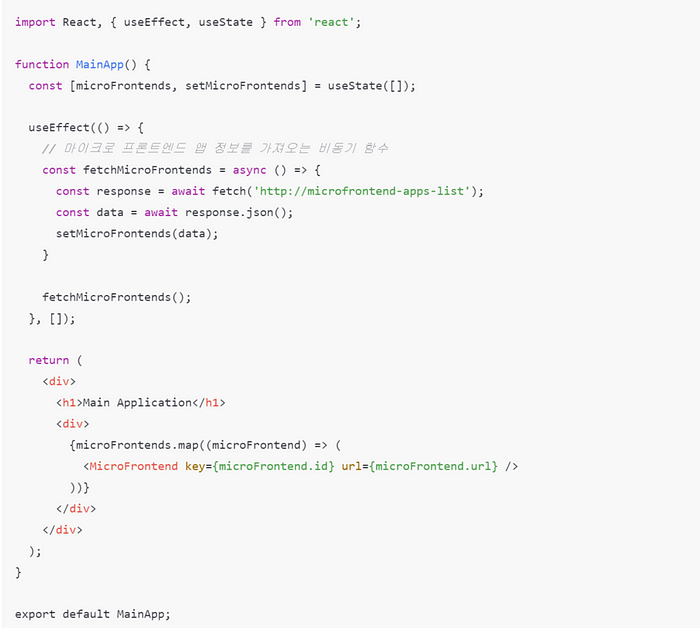 위의 코드에서 MainApp 컴포넌트는 마이크로 프론트엔드 앱 정보를 가져와 랜더링하고 MicroFronted 컴포넌트는 해당 마이크로 프론트엔드 앱을 IFrame으로 랜더링합니다. url은 각 마이크로 프론트엔드 앱의 url을 나타냅니다.
